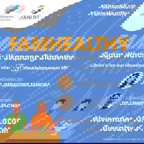 Alam niyo ba na ang diabetes ay isa sa mga leading causes of death sa buong mundo? At ayon sa World Health Organization, maliban sa mga matatanda at buntis, pati mga bata ay maaari na ring magkaroon nito. Kada taon, higit sa 2 million katao ang namamatay mula sa diabetes. Kung kaya naman sa #WorldDiabetesDay, samahan si Dr. Ging Zamora, Dr. Lennie Lee-Chua, and guest speaker Cynthia Clemen Yu Duntz, sa isang talakayan tungkol sa sakit na ito. May tanong tungkol sa iba't ibang klase ng diabetes? POST YOUR QUESTIONS NOW dahil pipili kami ng mga tanong sa post na ito na sasagutin ng ating mga doctors during the live. WHEN: November 10, 2020 | 6pm WHERE: https://www.facebook.com/theAsianparentPH/ Sugar Watch: Usapang Diabetes, dito lang sa theAsianparent Facebook page, LIVE sa Tuesday, November 10, 6pm. Kitakits!