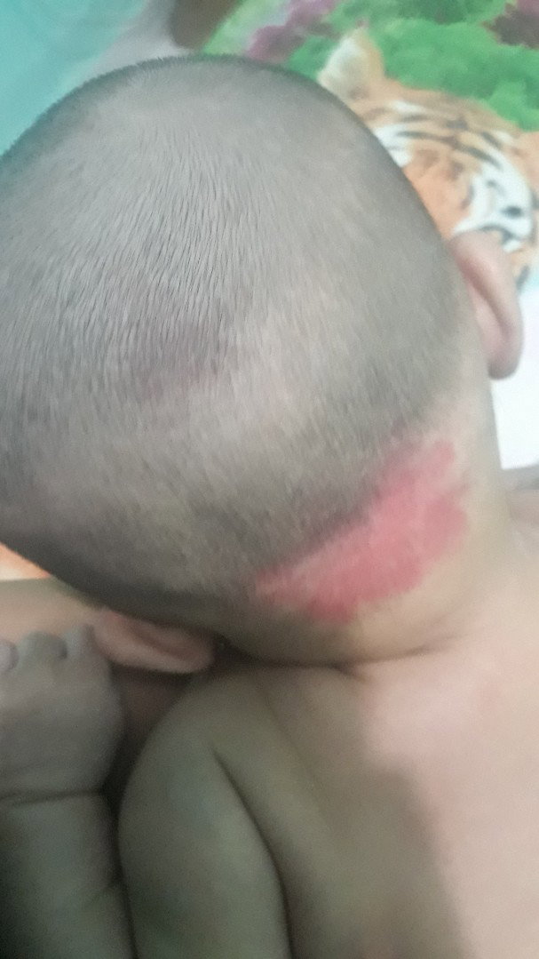 bayiku jg sama bun, persis posisinya spt itu. umur anak sya 2,5 bln. tp kata bidan gpp kok bun, klo aq perhatiin sih di anak aq itu mulai merah spt itu setelah rambutnya aq gundul, trus pas gendong kan posisi tangan memyangga kepala bayi, jdi mulai tampak kemerahan spt itu, tdinya besar spt itu bun tp skrng udah agak memudar, g tak kasih apapun sih karna dlu anak pertama jg spt itu, snakin besar ilang sendiri