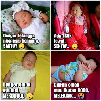 Anak aku dulu gituuu ππ. Denger suara orang sekampung jenguk tetep aja pules, denger emaknya teriak2 pun ga ngaruh, dibangunin buat nenen susah minta ampun. Tapi giliran denger suara kasur "kreot" atau sleting kelambu "srek" langsung kaget πππ