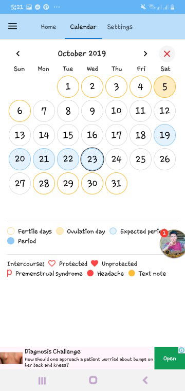 Yung yellow circle ang chances mo na pwede ka mabuntis. Yung yellow circle na shaded din ng yellow, un naman ang pinaka sure mo na mabubuntis ka, nangingitlog kung baga (ovulation egg) ung blue circle un ung days na maari kang reglahin pero ung huli na may black and blue circle un ung pinaka day ng regla mo.