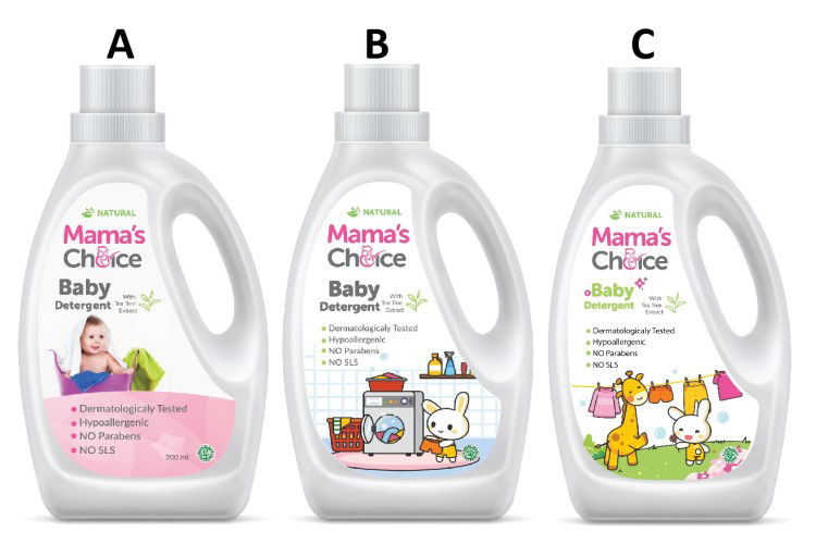 gambar B dan C menarik, lucu dan imut. Namun, fokus mata lebih ke A. Karena di botol A ada latar pink besar yang menarik mata untuk lebih melihatnya dibandingkan botol B dan C yang latarnya cenderung polos