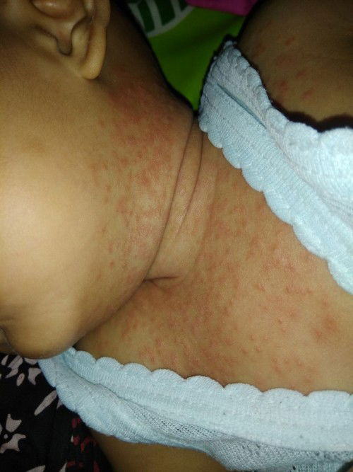 maaf Bun, anak saya dulu juga pernah ruam hampir kayak gitu, bahkan lebih parah karena semuka, kepala, leher, sampe tangan gitu Bun. sudah ke DSA dan dikasih salep tapi nggak ngaruh, terus pas sodara saya yang bidan main kerumah, kaget ngeliat anak saya kayak gitu, sama dia disuruh beli desolex cream, suruh olesin tipis-tipis aja tiap ruamnya muncul. eh Alhamdulillah cocok ternyata, pas ruamnya muncul diolesin itu, terus beberapa jam kemudian ilang sendiri ruamnya.