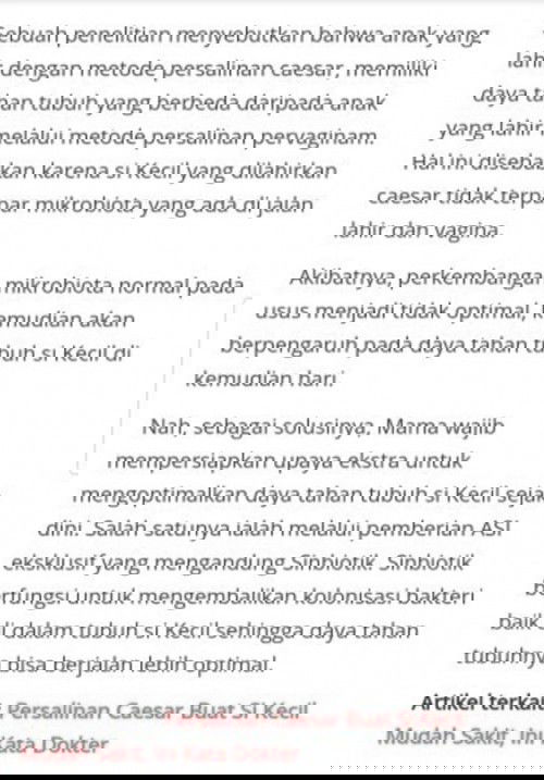 Beberapa waktu lalu ada postingan yang cukup membuat geram ibu-ibu TAP karena menyatakan bahwa "anak yang lahir SC rata-rata mudah sakit." Sayangnya, postingan tersebut bernada 'nyinyir' karena kurang informatif dengan tidak adanya data yang valid. Padahal yang posting nakes dan katanya sudah 15 tahun kerja. Tapi betul-betul tanpa data yang valid dan bs dipertanggungjawabkan. Saya ikut komentar dan cukup setuju dgn statement tersebut meskipun dengan hati yang getir. Kenapa? Pertama, karena saya diharuskan melahirkan secara SC oleh obgyn mengingat minus mata yg cukup besar dan kornea yg tipis. Tapi saya paham, itulah jalan terbaik yg harus ditempuh. Kedua, hal tersebut benar adanya. Sudah ada penelitian yang membuktikan bahwa ketika bayi lahir melalui jalan lahir, ada 'bakteri2 yang baik' dan tidak didapat apabila lahir secara SC. Link terlampir dari TAP. Tapi jangan khawatir, imun-is-ASI. ASI mengandung banyak sekali zat yang dibutuhkan bayi untuk bertahan dari paparan penyakit. Namun bukan berarti langsung jadi superman/popeye yaaa.. 😁 Mempelajari teknik menyusui yang tepat, sangat diperlukan untuk new mom. Bahkan, sebelum anaknya lahir, ayo belajar. Jangan karena #firstbaby jadi polos-sepoplos-polosnya. Hamil itu 9 bulan. Yuk banyak belajar, jadi ibu cerdas demi anak yang sehat dan cerdas. https://id.theasianparent.com/dampak-opreasi-caesar https://id.theasianparent.com/mempersiapkan-persalinan-caesar/web-view/?pinned=post #bantusharing #sharingiscaring