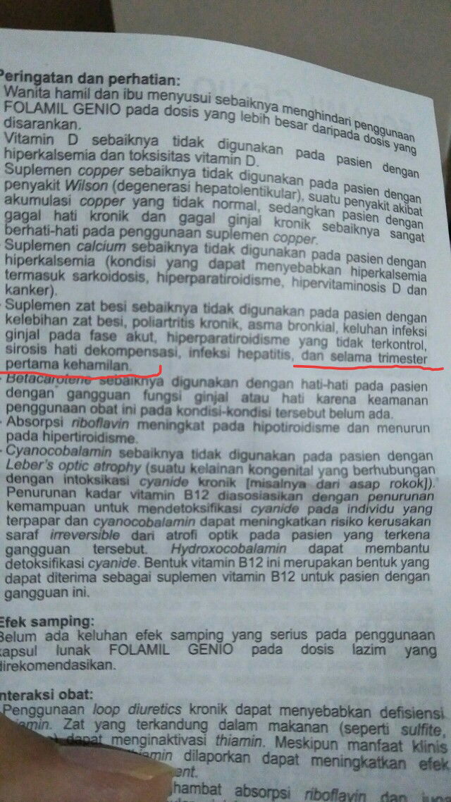 makanya di atas tertulis ibu hamil tidak boleh minum folamil genio dengan dosis yang berlebihan atau tidak sesuai anjuran. Karna efek"nya itu ya yang tulisan di bawahnya per vitamin dapat menimbulkan efek sebagaimana di tulis pada keterangannya