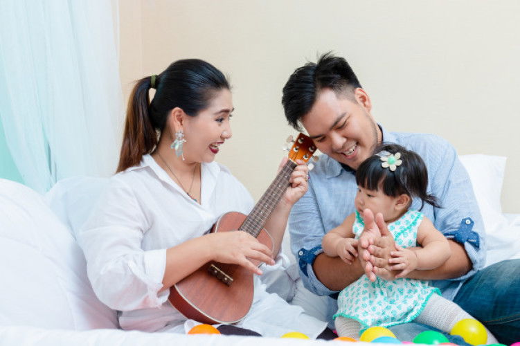 kebetulan ayahnya musisi, bundanya yaa bisa lah dikit² mah.. jd klo lg iseng ayahnya yg main musik bunda nya yg nyanyi/sholawatan😄