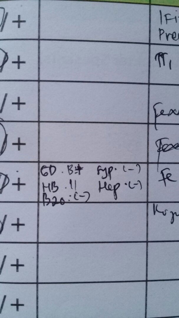 GD: golongan darah HB: hemoglobin nya 11 B20: HIV negativ Syp: sipilis negatif Hep; hepatitis