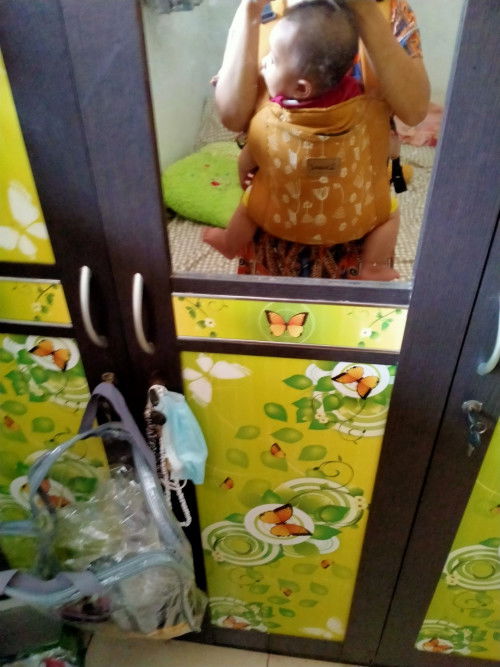posisinya dibenerin lg, harus sejajar sm dagumu mba. Pokoknya smp km bisa nyium kening anakmu oke dah itu