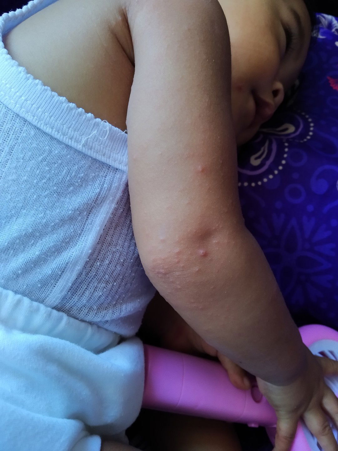 Bu, itu bintil2nya muncul hanya di situ aja, atau ada juga di kakinya? Telapak tangannya gimana, ada bercak kemerahan, ga? Anaknya demam, ga?