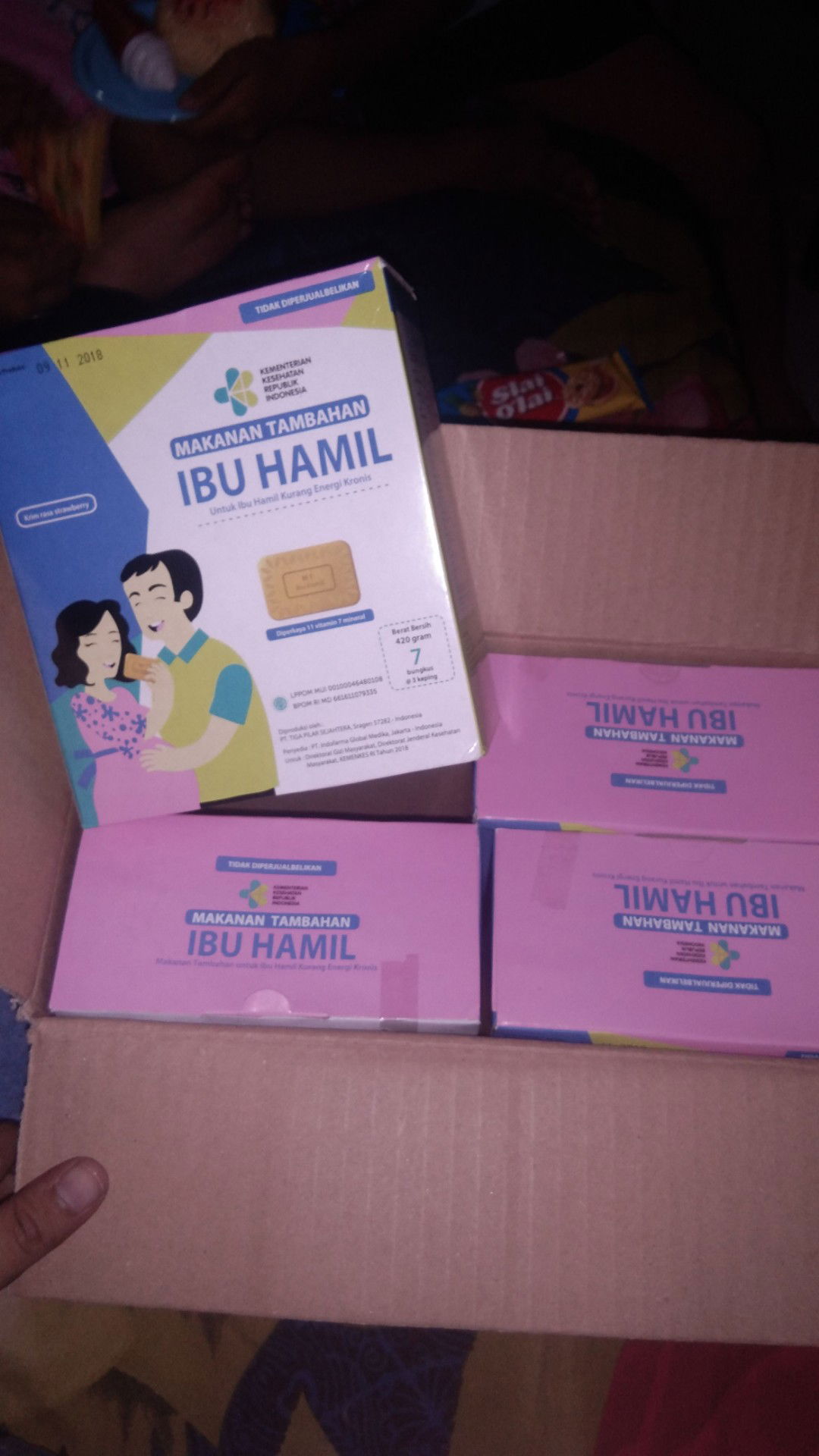 Baca lagiAku dlu dapet pas awal kehamilan 1box kaya gitu.pas sampe rumah aku buka dan mau coba makan ternyata baru di buka aku udah mual duluan jadi nya ga kemakan sama sekali itu 1box.klo cium biskuit itu mual.pas bulan depannya mau di kasih lagi sama bidan nya tapi aku tolak soalnya aku mual klo nyium bau biskuit nya.