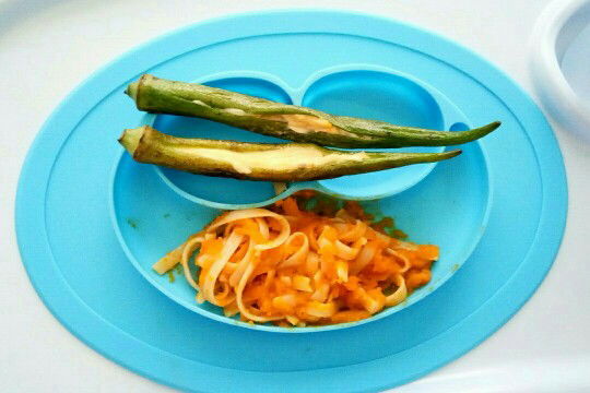 Dwayne 13 Months 8 Teeth #BLWsince8months • Lunch ? • Fried okra w/ Cheese ? • Squash pasta ? W/Garlic powder & Basil leaves Taob ang pasta ubos simot sarap ? Nomnom