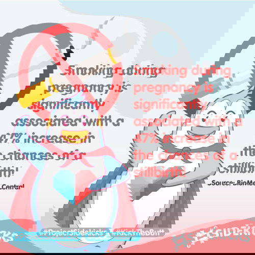 An analysis of 25 studies by Biomed Central in the UK concluded that smoking during pregnancy was significantly associated with a 47% increase in the odds of stillbirth! It's time to #KickTheButt. Stop smoking and reduce your smoke exposure. #ProjectSidekicks #TAPSidekicks