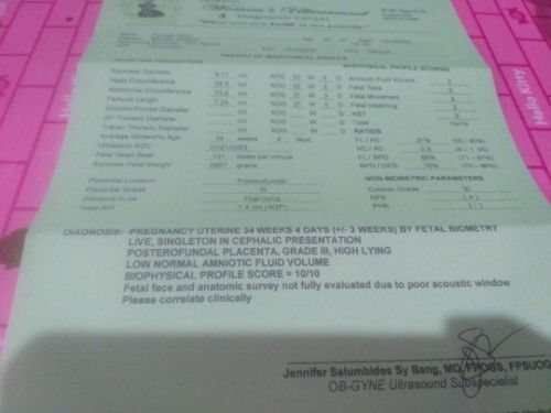 below normal yung amniotic fluid mo at grade 3 na yung placenta mo pero 34weeks ka palang.. pag grade 3 kasi, hinog na ang placenta at malapit na manganak. Suggest na ipakita mo yan sa OB mo, asap paraamonitor ka at si baby.. Ingat po at Godbless.