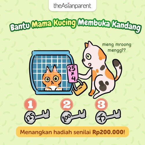 Baca lagimama kucing mau buka kandang untuk mengeluarkan anaknya. mama kucing : Nak ayo bantu mama untuk memilih kunci yang benar untuk membuka kandang ini agar kamu bisa keluar dan bisa bersama mama lagi Anak kucing : Ayo ma, kalau begitu kita berjuang bersama2 Mama kucing : Iya nak, kalau begitu ayo kita pecahkan kuis ini untuk menemukan kunci yang benar. DiGembok kandang tertulis perkalian 25x4 nak. Dan disini ada 3 pilihan jawabannya untuk kuncinya 1. 125 2. 100 3. 75 kita pilih yang mana yaa? Anak Kucing : kita pilih yang nomor 2 ma. jawabannya 100 ma. (25x4=100) Mama kucing : Wahh benar, anak mama pintar. kalau begitu mama ambil kunci nomor 2 untuk membukannya ya Anak kucing : Siap mamaku sayang π₯°