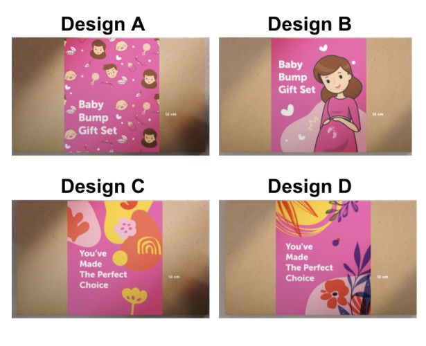 Dari desain kotak hampers/ hadiah untuk berisikan produk ibu hamil, manakah yang Bunda suka?