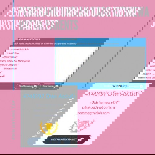 Hi, Bunsay! Waktunya pengumuman pemenang undian reward nih Bun, berikut adalah pemenang Poin Untung TAP bulan Mei ya๐ Ada 9 pemenang yaitu: 1. Pemenang [UNDIAN] Kado Istimewa Untuk Parents : Bunda Dwi Astuti 2. Pemenang Mystery Box: Hadiah Seru Untuk Si Kecil : Bunda Solikah Afriani 3. Pemenang [UNDIAN] Paket Makan Seru Untuk Si Kecil : Bunda Amelia 4. Pemenang [UNDIAN] Kado Manis Untuk Si Kecil : Bunda Meli Aditiyan 5. Pemenang [UNDIAN] Kado Istimewa Untuk Si Kecil : Bunda Hilmi Yanti Karimah 6. Pemenang [UNDIAN] Kejutan Istimewa Untuk Parents : Bunda Iis Aisyah 7. Pemenang [UNDIAN] Hadiah Special Untuk Parents : Bunda Sintia 8. Pemenang [UNDIAN] Hadiah Istimewa Untuk Parents : Bunda Marza Nita 9. Pemenang [UNDIAN] Kado Manis Untuk Parents : Bunda Rika Rohim SELAMAT YA UNTUK PEMENANG! Untuk pemenang akan dihubungi oleh Tim theAsianparent melalui whatsapp atau email. Silahkan Bunda nanti melakukan konfirmasi dengan mengirimkan nama, alamat, dan nomor telepon lengkap dan jelas tentu akan mempermudah pengiriman barang. Batas terakhir konfirmasi yaitu 14 hari setelah dihubungi oleh tim kami, jika tidak melakukan konfirmasi maka hadiah dianggap hangus. Jadi, jangan lupa untuk menyertakan biodata lengkap ya, Bun! Jangan lupa ya kasih bintang 5โ gampang banget caranya klik link ini aja Bunsay http://bit.ly/37hWWHa. TERIMA KASIH! Ditunggu Poin Untung TAP kloter berikutnya ya, Bun! Tentunya dengan hadiah-hadiah seru dan menarik lainnya๐