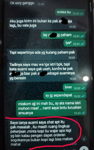 https://community.theasianparent.com/q/https_community_theasianparent_com_q_https_community_theasianparent_com_q_agak_g/5513382?d=android&ct=q&share=true Suaminya aneh banget pula, kelakuan istrinya kek gitu malah didukung. Kok suaminya gak cemburu istrinya pake bahasa manja2 ke laki2 lain. Normalisasi minta2 pula. Dulu aku berhadapan sama beberapa vendor, gak pernah minta apapun ke mereka, & gak pernah nyuruh2 orang lain buat cariin lowker apalagi ke lawan jenis. Aku sama rekan kerja & vendor emang gak selalu pake bahasa formal, cuma gak pernah terlontar pake bahasa manja2 ke laki2 yg bukan tempatnya/ bukan pasangan. Jawab: Bahasa pas dia manja2 gak aku capture, nanti kebanyakan. Emang bahasa yg aku udah screenshot di apk ini mah biasa aja. Cuma ada chatan yg udah lalu pake bahasa manja. & Baru di chat ini doang dia pake kata "saya". Aku kerja juga gak pake bahasa formal, kecuali pas meeting & email report iya formal. Cuma gak pernah pake bahasa manja2 ke lawan jenis. Di tempat kerja ya disesuaikan bahasanya. Kalau konteks minta2nya bercanda tapi kok sering. Aku gak setuju normalisasi ruang lingkup sekelas karyawan menerima sogokan & merasa normal aja kalau minta2, ke A minta makanan, ke B minta persenan. Padahal udah punya gaji dari perusahaan. & Itu memang pekerjaan dia membeli bahan baku dari perusahaan lain untuk produksi suatu produk di tempat kerjanya.