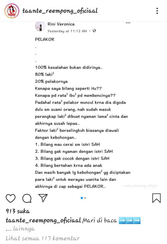 Baca lagiDua2nya salah tapi yang porsi salahnya paling besar ya bener suami bukan c pelakor karena sebenernya disini yang harusnya punya komitmen kan suami. Kl dari awal suami komit sama perkawinan mau dia digoda sama 1000 wanita cantik pun ga akan ada efeknya. Pasti dicuekin wanita2 yang deketin. Karena wanita itu mainnya pake perasaan jadi kl digoda dikit pasti baper sedangkan pria mainnya logika. Makanya walaupun terkadang istri2 diluar sana suka menyalahkan pelakor dan suka berperilaku barbar terhadap pelakor tapi c pelakor tetep aja deket sama suami ya karena suami sendiri pun masih mendekati pelakor. Yang harus dibenahi itu rumah tangganya bukan pelakornya. Kenapa jg mempertahankan pernikahan yang salah satunya sudah tidak punya komitmen.