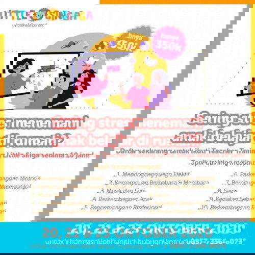 Halo, Bunda! Tertarik untuk mengajar anakmu berusia 3 tahun ke atas? Tapi, bingung mau training di mana? Yuk, ikutan training dari Little Singa by theAsianparent besok jam 9 pagi! Materinya bisa Parents lihat di foto bawah. Klik di sini untuk daftar dan tanya lebih lanjut: http://wa.me/6285773568075