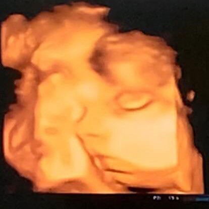 MasyaaAllah Tabarakallah, USG usia kandungan 34w2d dedek malu-malu nutupin tangannya ke muka sebelah, jadi mommy cuman bisa lihat dari samping doang, udah di toel toel tetep gakmau ngadep depan 🤭 HPL 22 November Baby Girl#firstmom