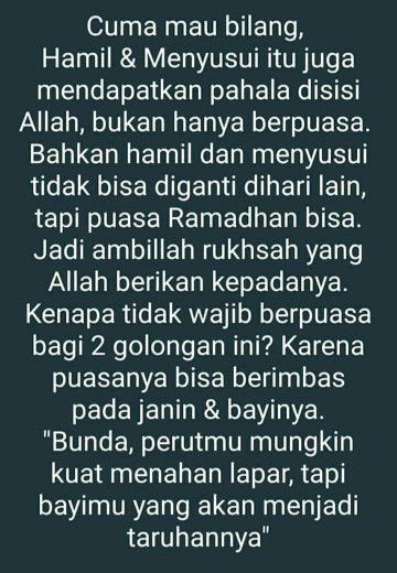 Baca lagiBijak aja sih menyikapinya, gausah jd bahan perdebatan. Bumil busui yg puasa ya silahkan dilakukan & jgn nyinyir ato komen negatif dgn bumil busui yg ga puasa, mereka ga dosa kok, justru dgn km nyinyir malah km yg dosa, puasamu cm dpt lapar & haus aja. Dan utk bumil busui yg ga puasa jg gpp, ada keringanan. Allah ga akan murka krn km lebih mementingkan kondisi mu & si janin. Justru Allah ga suka kalo kita berbuat dzolim terhadap diri sendiri, apalagi ke janin. Ibadah semua Allah permudah kok. Yg sakit aja kalo ga bisa sholat sambil berdiri boleh dgn duduk bahkan berbaring. Yg ga puasa krn udzur hamil ato menyusui bisa diganti fidyah & qodho di lain hari Udah ya, yg kayak gini ga perlu dijadikan bahan diskusi, semua udh ada aturannya. Yg ada bukannya diskusi sehat tp malah saling nyinyir