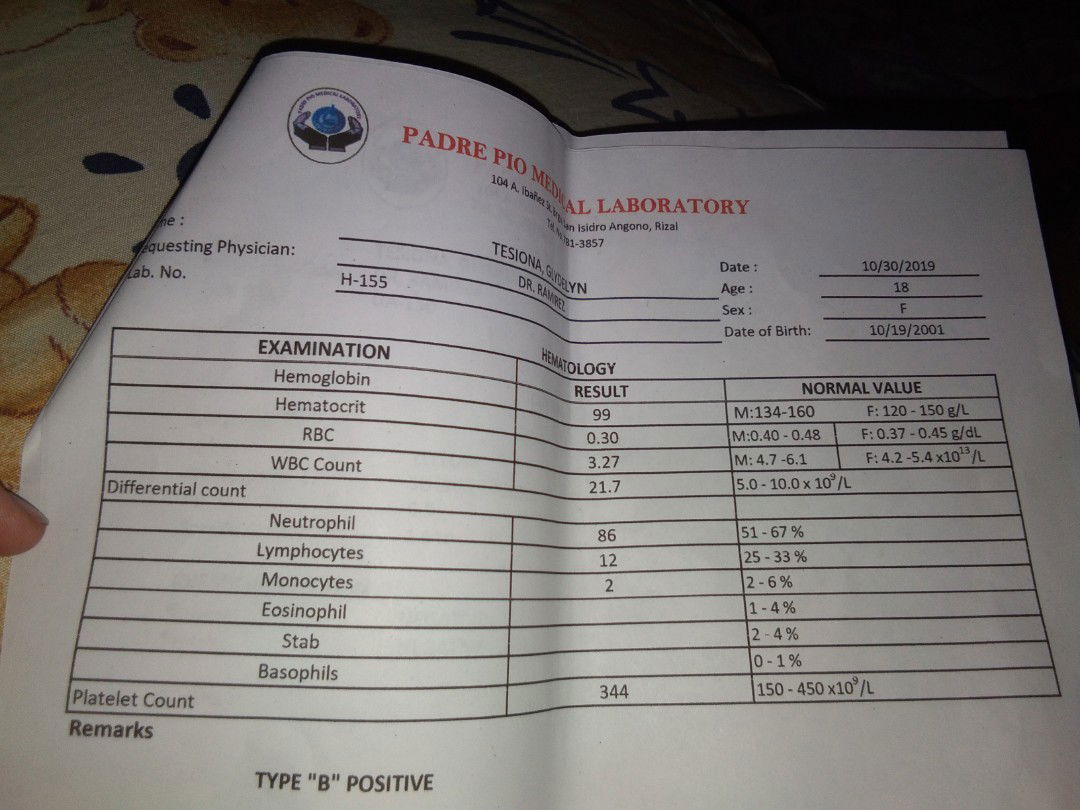 Mababa both hemoglobin and hematocrit mo mosh kain ka ng pampataas dugo. Sa case ng katrabaho ko pinag ferrous sya twice a day... tapos mataas din wbc mo. May uti ka na momsh.