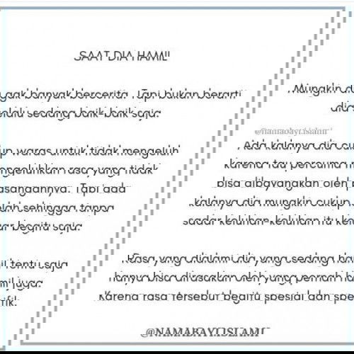 Baca lagiSaat dia mulai lambat berjalan,.. Suami : Ma, balapan yuk. Kali ini papa yg ninggalin mama (suami pengalaman ditinggal lari pas hujan 🤣🤣) Dia yg biasanya fokus mendadak pelupa. Istri : pa, tadi kita udah diskusi xyz kan. Kesepakatannya apa ya? Suami : mama tulalit 🤣🤣
