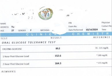 Hello po mommies! Ask ko lang po sana if ano po ang basa sa result ko po? Thank you. RESULT REFERENCE FASTING GLUCOSE 89.2 70-115 mg/dL 1 hour post glucose load 152.6