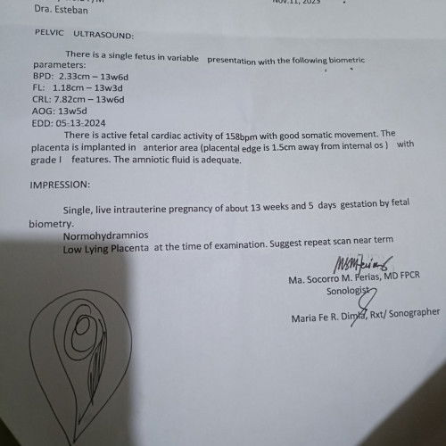 low lying placenta ka mommy. ang usual na placenta ay nakapwesto sa itaas na bahagi ng matres. Yung sa inyo po ay nasa baba malapit sa kwelyo ng matres kaya maaaring makaranas ka ng spotting during your pregnancy at maging candidate for cesarean sakaling matuloy ang iyong pagbubuntis.. Ingat mommy pacheck up lang po kayo lagi para maalagaan.