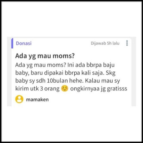 Selamat hari Jumat Parents! #JumatBerkah Seperti biasa, setiap hari jumat program Donasi theAsianparent hadir kembali! Bagi Parents yang berdomisili di area sekitar Cikarang dan sedang butuh pakaian bayi layak pakai, silakan tuliskan alasannya di kolom komentar postingan Parents satu ini ya: https://community.theasianparent.com/q/ada_yg_mau_moms_ini_ada_bbrpa_baju_baby_baru_dipakai_bbrpa_kali_saja_skg_baby_sy/5285508 Pihak theAsianparent dan Donatur akan berupaya memilih 1 orang penerima Donasi yang tepat. Bagi Parents yang juga ingin berdonasi ke sesama Parents yang membutuhkan, silakan posting di topik Donasi ya. Baca aturan donasinya di sini: https://community.theasianparent.com/q/halo_parents_theasianparent_punya_pengumuman_penting_karena_banyak_parents_yang_/5258923 #DonasiTAP
