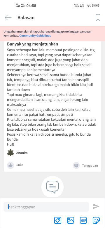 nah ini yg saya maksud, ini aplikasi untuk bumil loh dmana mayoritas sudah pasti perempuan tapi gak ada women support women. klo ada yg bilang "wajar aja namanya medsos" ini tuh pemikiran yg salah menurut saya, why? please lah kita udah menikah, lebih dewasa sedikit menggunakan sosmed, ini bukan sosmed sperti fb/ig/ataupun tiktok loh, ini lebih ke aplikasi tentang edukasi jadi jelas berbeda. klo setidaknya gak bisa berempati ke orglain yauda gak usah berkomentar jahat, lebih baik diam. saya pernah baca postingan seorg ibu yg hamil diluar nikah, beliau curhat masalahnya. dan yg bikin saya heran, ada beberapa user yg justru malah ngejudge ibu dan bilang "LAGIAN KOK BISA2NYA HAMIL DILUAR NIKAH" duh gak ada otak! ibu itu curhat krna butuh wadah buat keluh kesah, butuh saran dgn apa yg sudah terjadi, butuh supoort dri sesama perempuan. tapi apa? malah ada manusia dgn IQ diatas rata2 malah menghujat si ibu. please loh, ibu ini sepenuhnya sadar bahwa beliau salah, tapi apapun yg dia lakukan kita gak berhak buat menghakimi. loh situ mau jadi tuhan? mental orgpun berbeda, klo seandainya ibu ini tersinggung sama hujatan kalian lalu apa kalian mau tanggungjawab atas ketikan kalian? apa kalian mau disalahkan jika membuat si ibu tersebut justru jadi depresi dan ngedown? si ibu lagi hamil loh, kalian bukan cuma jahat ke beliau tapi juga calon anaknya. jadi mohon untuk para ibu, untuk bijak dalam menggunakan platform manapun. jaga ketikan.
