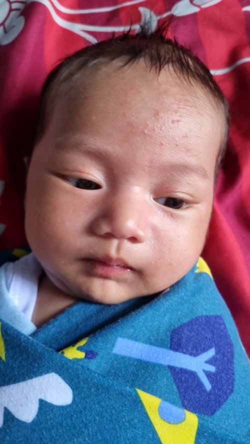 anak saya juga gtu bun, umurnya baru 1 bulan,, bahkan semua wajah gtu semua, awalnya pakek baby cream cusson tp msih merah" gtu,, trs saya kasih caladine cair cepet keringnya bun,, alhamdulillah 3 hari udah ilang bintiknya,