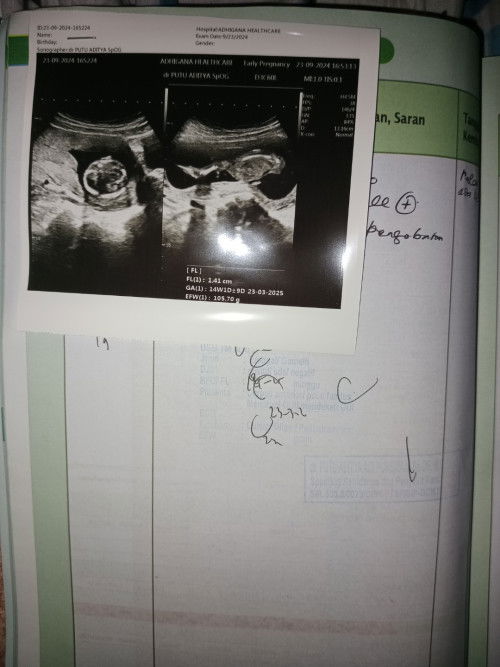 fl.... panjang tulang paha janin 1.41 cm GA... usia kehamilan 14W 1D perkiraan lahir tanggal 23 03 2025 EFW... taksiran berat janin 105.70 g