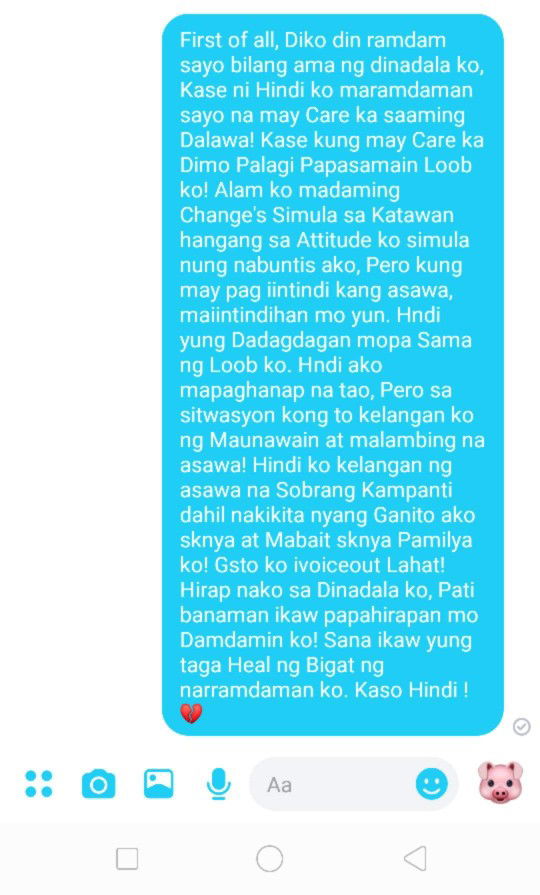 Share kolang po mga mommies. ? Sorry kung mahaba! I want to express my Feeling! ?? ** Kasal kame ni Lip, Last Aug.2.19 and 7mos Preggy nako now! After wedding saka Lang kame nag sama (Pero dto kame sa side ko) May bahay Kami bigay ng Parent's ko kaso sabe ni Mama wag daw muna Lumipat kase mahirap daw buntis pag mag isa. Wala sya dito problema sa bahay, Lahat pinapakitunghan kame ng maayos simula kay Papa,Mama at mga Kapatid ko. ? In short sobrang swerte nya kase nakatagpo sya ng babae na may masaya at mabait na Pamilya. ❤❤ Teacher po ako mga mamsh, and sya ay isamg Securty Guard sa Podium , Pero dahil Buntis ako kelangan ko mag stop sa Pagtuturo. So sa ngayon sa Gastusin ko kay Lip muna ako umaasa ng Pera , Gastusin sa araw araw. ? ** Okay naman kame nung unang mag GF/BF palang kame, (Yung dipakame nag sasama sa Iisamg Bubong, Yung tamang Bisita lang sya sa Bahay) tas Sobrang sweet nya saakin, Di nya hinahayaan na nagagalit ako. yung Pagmamahal ramdam na ramdam mo talaga ! ? But after the wedding , madami akong naramdaman sknya . May Time pa nga na sobrang magkaaway kame :( Tas nasabe nya saakin na nagsisisi sya Bat kame nag pakasal. ? nasumbatan pako onetime na mas nag gastos sya nung nagkasal kame, at sinabe nya rin simula nung araw nayun nagkautang sya ng 20k na until now dinya pa bayad sa Bayaw nya. ??? * Sobrang sakit Lang kase saakin na Sobrang Sakit na nya mag salita! Minsan Uuwi sya dito Galing work sa halip kmustahin kame ni baby sa tummy ko wala kang Marinig. Kahit sana Konting Lambing lang from him wala! Busy agad sya Kaka-CP at mag Laro ng OL GAMES hangang sa Makatulog nalang ako ng wala lang. Tas gising ako umaga para paghainan sya, Kakain Lang tas pasok na sa work ?? Sa side ko , Gusto ko sana Kahit Konting Paglalambing Lang sana. Diba Kelangan naman yun sa Mag asawa. Iniisip ko baka pag Labas ni baby Ganun at ganun Lang din Gagawin nya. Tas aasahan nya pako mag asikaso sknya khit Kaya naman nyang Gawin. ??? Kung tutuusuin mga mamsh. Kahit Hirap na Hirap nako sa sitwasyon kong to Pinipilit kopa din Lumaban. ?? Tapos Kagabe sobrng sama ng Loob Ko, Biniro nya ako na Nagsisisi na sya kase antaba at ang Panget Ko ba daw. ???
