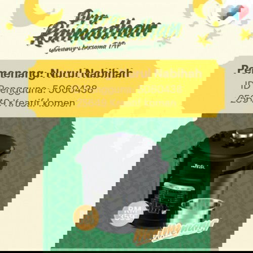 Terima kasih kepada semua yang telah menyertai pertandingan Pra-Ramadhan Giveaway bersama TAP yang lalu. Tahniah diucapkan kepada pemenang yang terpilih iaitu Puan Nurul Nabihah dengan sebanyak 25649 Kreatif Komen🥳 Pemenang telah berjaya membawa pulang sebuah periuk tekanan Tefal (pressure cooker) bernilai RM359! Kepada yang tidak berjaya, jangan lupa untuk sertai pelbagai lagi pertandingan menarik sepanjang bulan April ini ya!😉