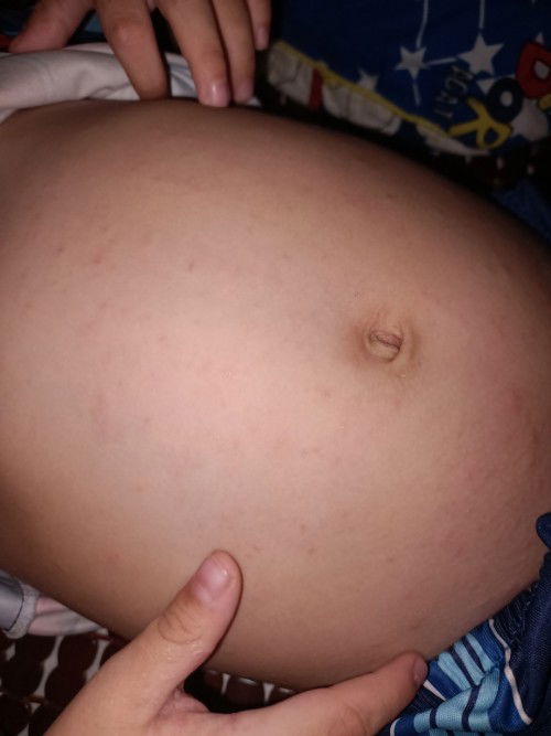 chắc là nóng quá thôi mom, sao mình nhìn thấy bụng bé to vậy mom